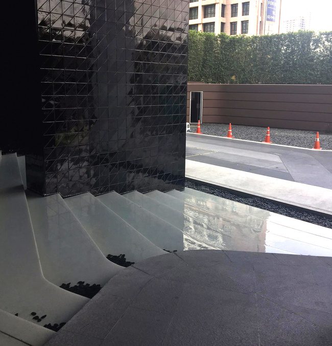 Зачем делать водопад в виде ступеней возле входа в здание? Чтобы было больше падений на мокрых камнях?