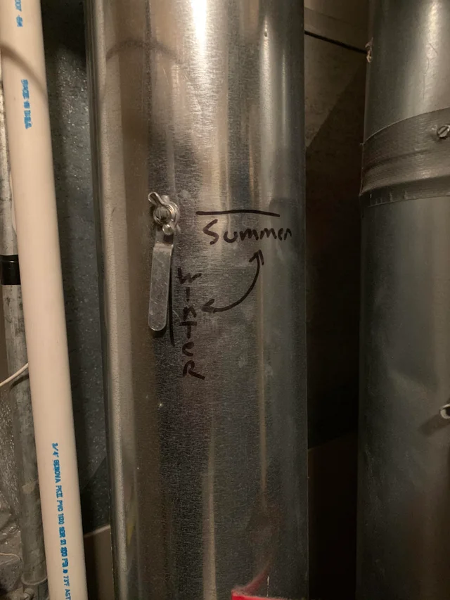Судя по всему, это рычаг центрального воздухоувлажнителя. Зимой воздух в доме увлажняется. Летом все закрывается, поскольку с влажностью в это время проблем не возникает.