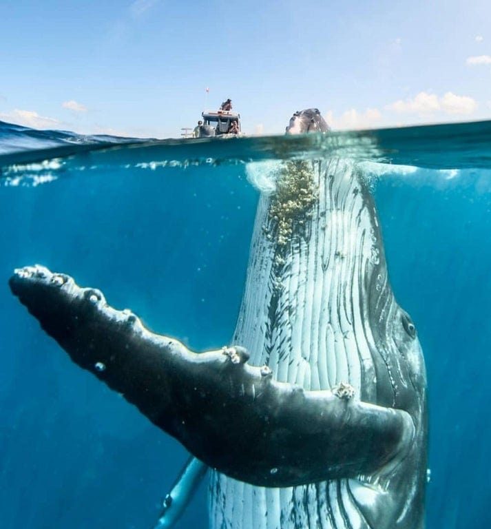Деликатность кита: высунул только кончик носа, чтобы понюхать ребят на катере