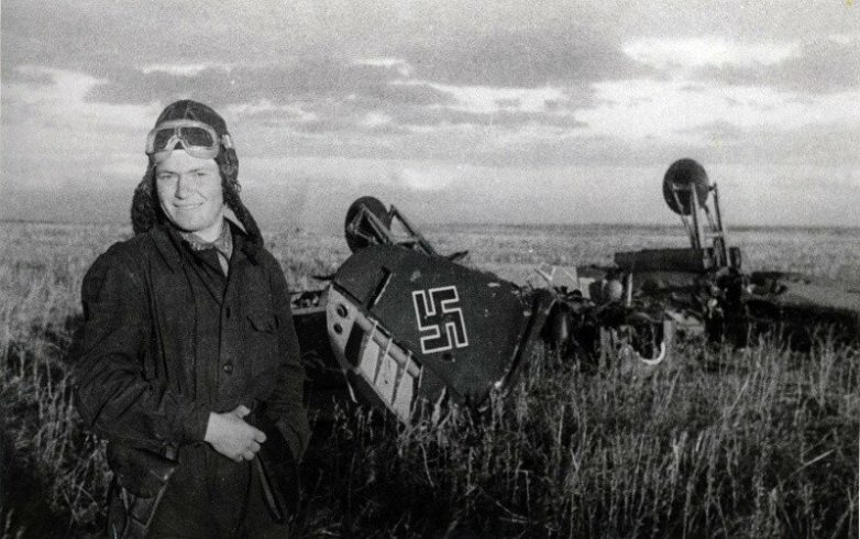 Летчик 237 ИАП сержант Илья Чумбарёв у обломков сбитого тараном немецкого самолета Fw.189