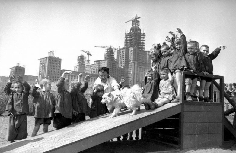 На заднем плане — строительство МГУ, Москва, 1951 год