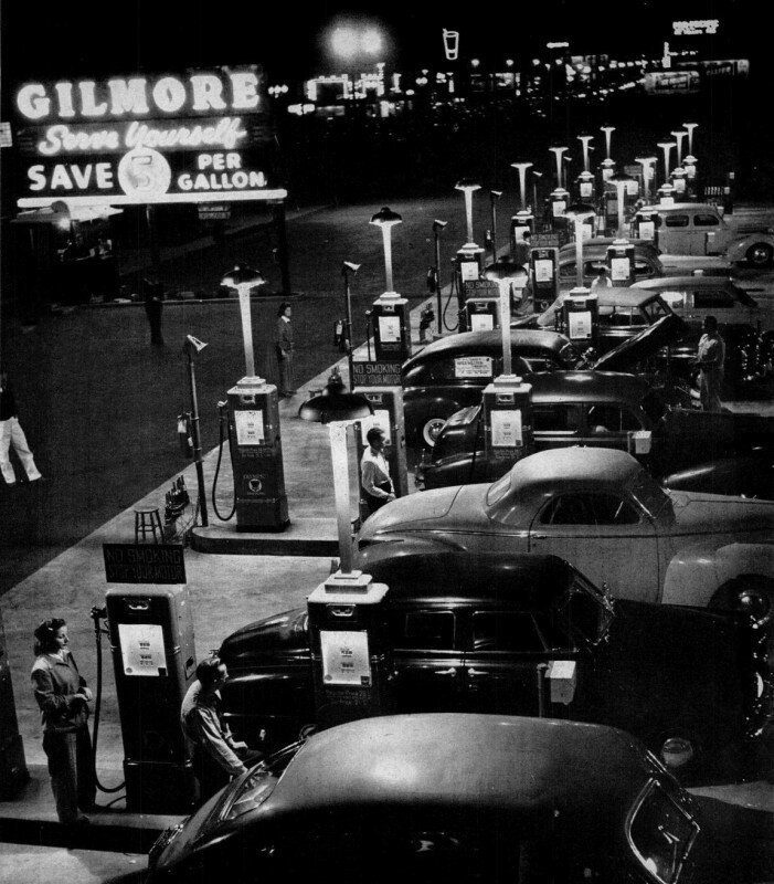 Первая АЗС самообслуживания в США. За счёт отсутствия заправщиков бензин стал дешевле на 5 центов за галлон. Лос-Анджелес, 1948
