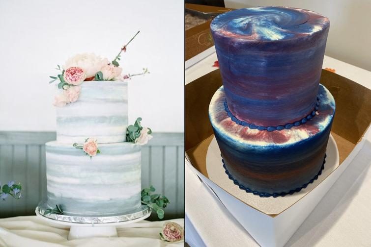 «Торт, который мы с женой ожидали (без цветов) и тот, который появился в день нашей свадьбы»
