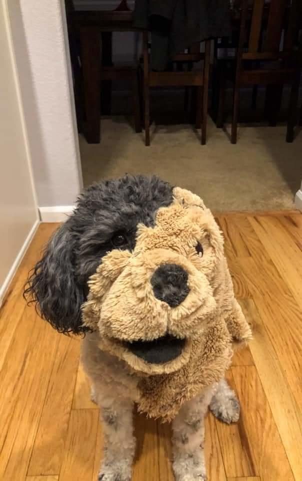 Собакенштейн. Собака разорвала плюшевого медведя и владельцы надели остатки игрушки ей на морду