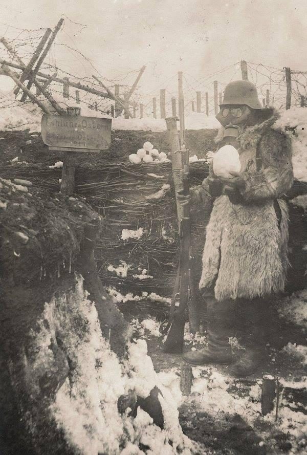 Немецкий солдат в противогазе с пасхальным яйцом из снега празднует в окопе Пасху, Первая Мировая, Восточный фронт, 1917 год