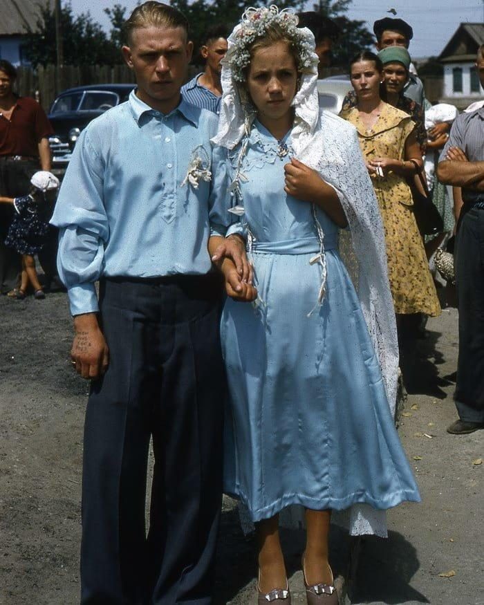Свадьба, СССР, конец 1950-х. Татуировка на руке жениха гласит: «Люби меня, как я тебя!»