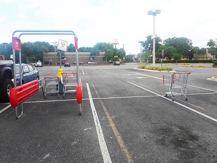 Красная штука – место для тележек. Там и написано, и нарисовано, но многие взрослые люди не понимают ни прямых указаний, ни намеков