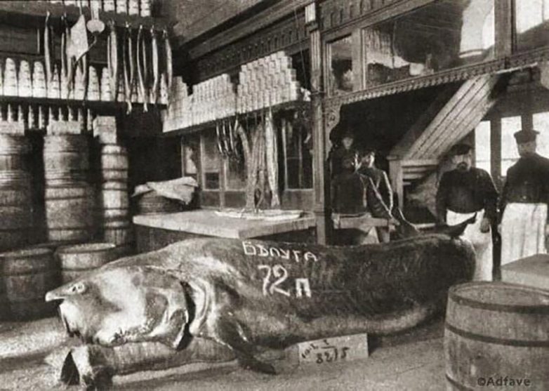 Белуга, выловленная в Каспии, 1910-е. Выставлена в магазине В. Ф. Бобкова на Балчуге. Весила 1152 кг (72 пуда)