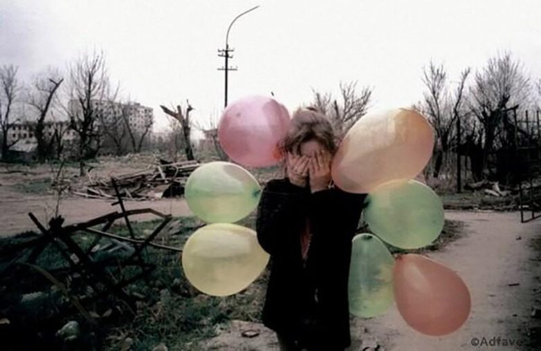 Девочка закрывает глаза от фотографа в центре разрушенного города Грозный, Чечня март 2002 года