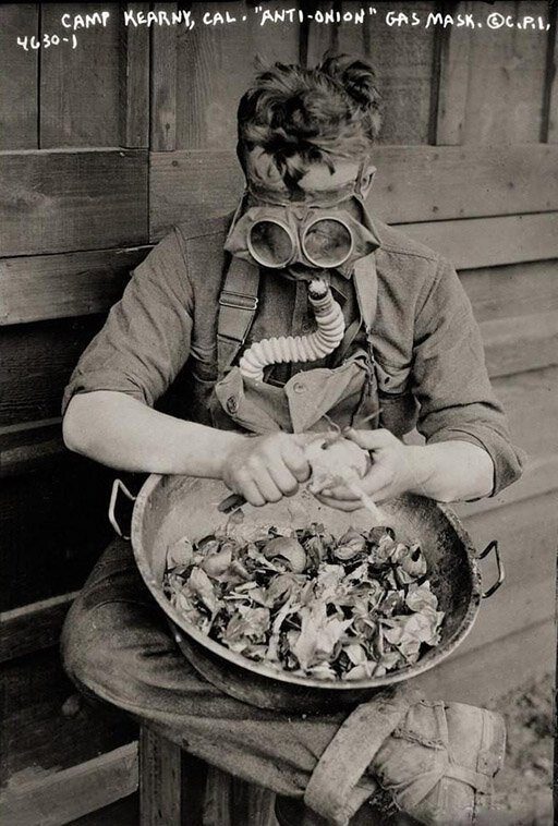 Американский солдат в тренировочном лагере чистит лук в противогазе, США, 1918 год