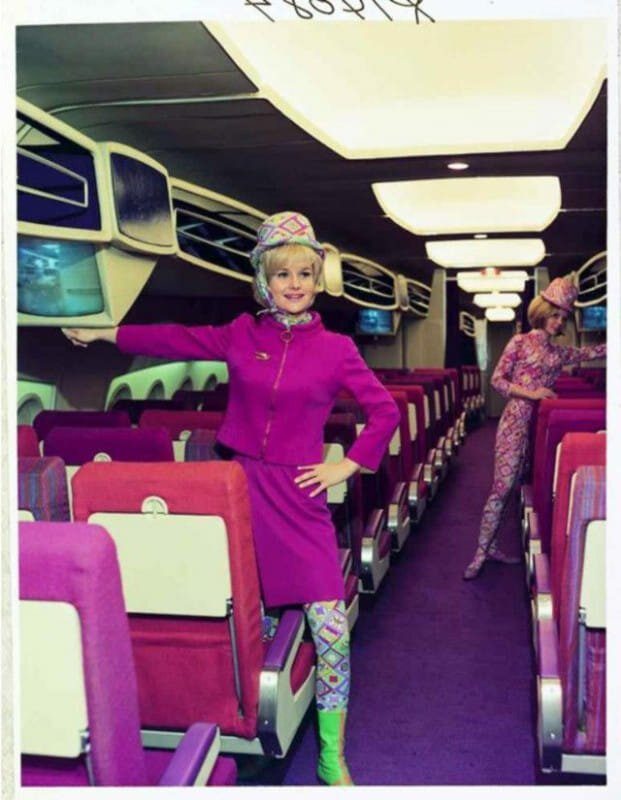 Стюардессы американской авиакомпании «Braniff International Airways» в психоделической униформе, разработанной итальянским модельером Эмилио Пуччи. 1966 г.