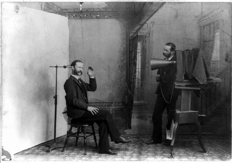 Макс Фактор снимает мерки с актрисы Марджори Рейнольдс с помощью изобретенного им «микрометра красоты», 1934 год