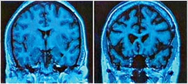 Слева — нормальный мозг 43-летнего человека, справа — мозг 43-летнего алкоголика
