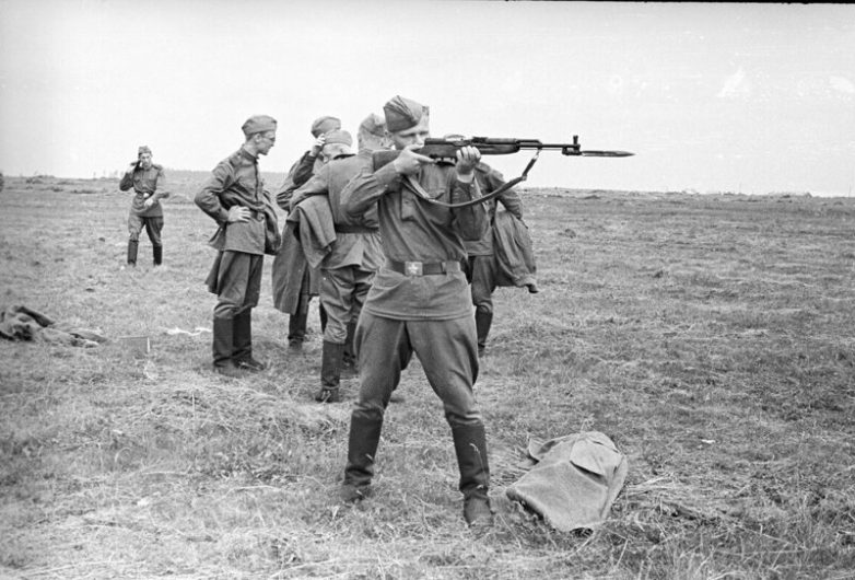 Тренировка советского спецназа. В прыжке с переворотом солдат успевает метнуть топорик в мишень.
