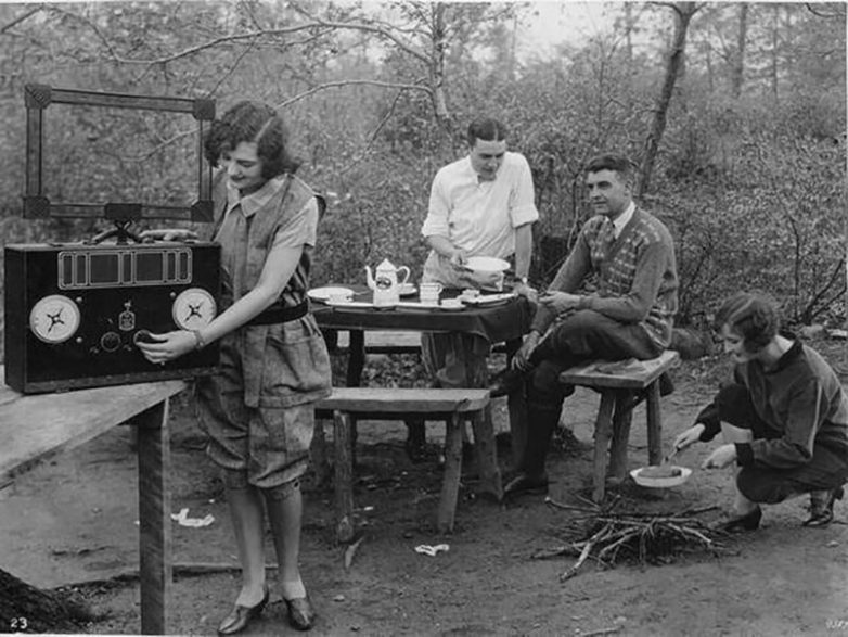 Рекламная фотография портативного радиоприёмника, с помощью которого можно наслаждаться музыкой даже находясь на пикнике. США, 1925 год.