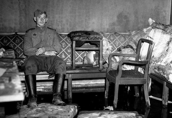 Советский солдат отдыхает в комнате, в которой Гитлер покончил с собой