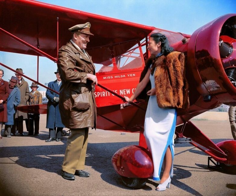 Китайская летчица Хильда Ён принимает в дар новый самолет от полковника Роско Тёрнера, Вашингтон, округ Колумбия, 1939 год.