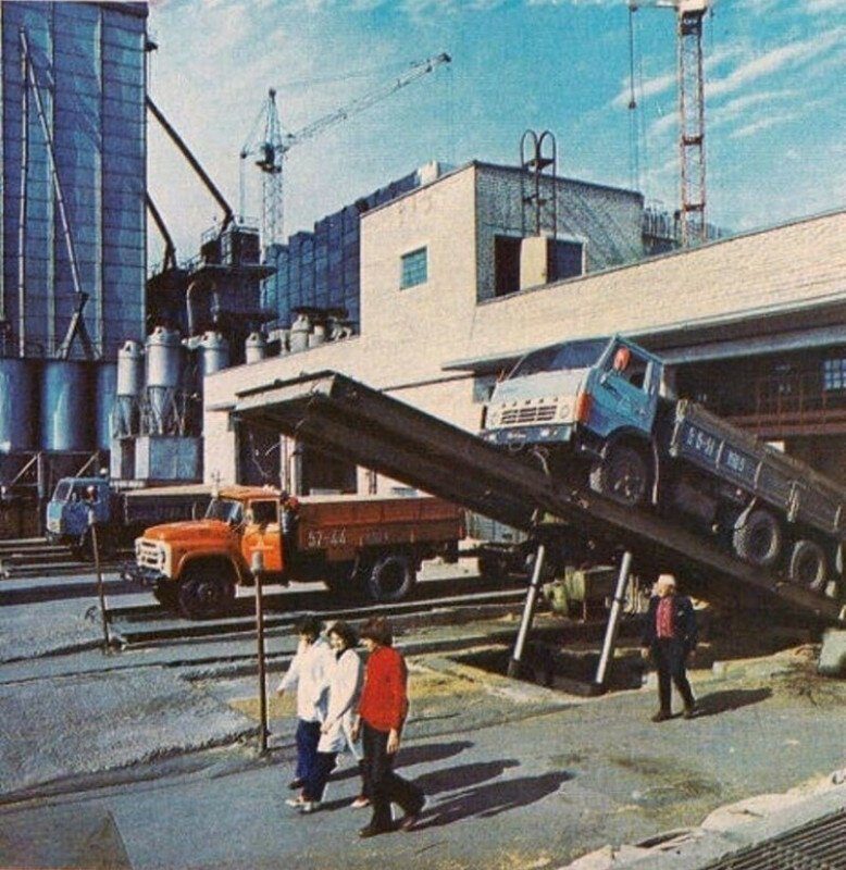 Процесс разгрузки бортовых грузовиков с зерном на территории одного из крупных элеваторов. СССР, 1980-е
