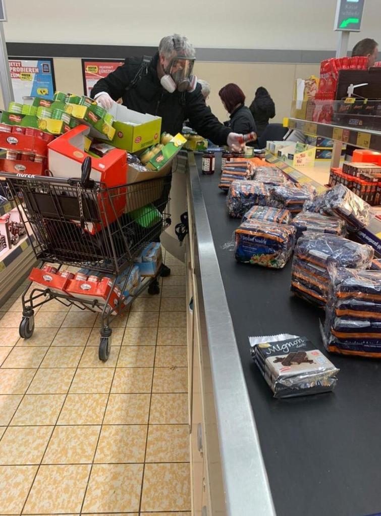 Мужчина покупает продукты в супермаркете, будучи в противогазе после подтвержденной инфекции коронавируса в Австрии
