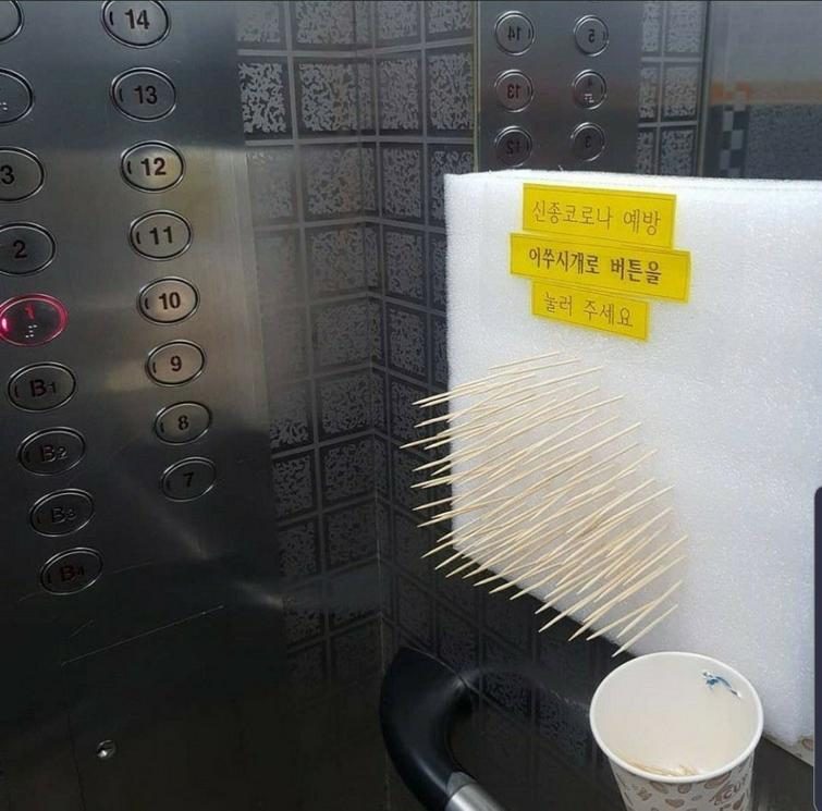 Знак в лифте в Южной Корее, на котором написано: «Используйте зубочистки, чтобы нажимать кнопки»