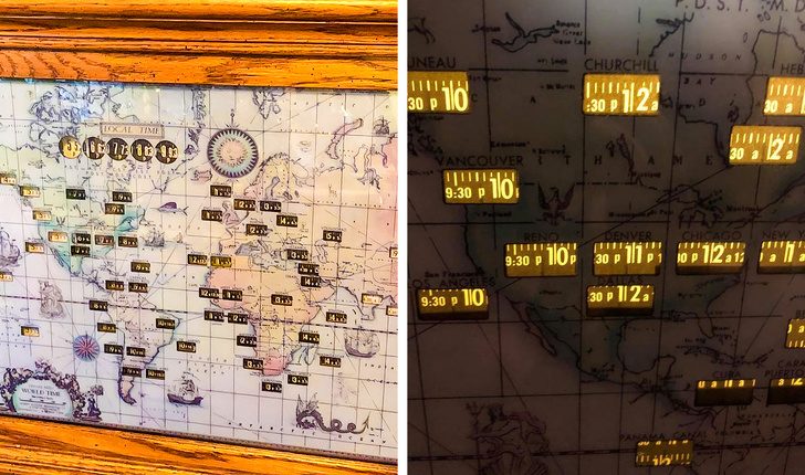 5. На этих часах отображено все мировое время сразу, по ключевым регионам. Они с подсветкой и учитывают день и ночь.