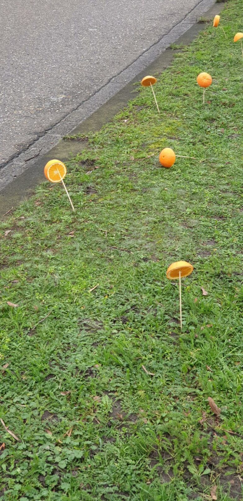 «Зачем люди накалывают апельсины на палочки и оставляют на газоне возле дороги? Увидел такое в Нидерландах».