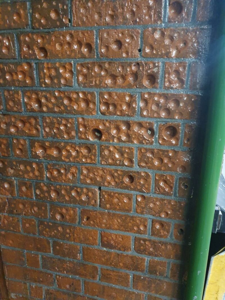 Их делали люди намеренно при помощи денег. Ожидая своего поезда, многие скучали, поэтому прислоняли монетки к кирпичу и проворачивали. Понадобились десятки лет для придания обычной стене такой загадочности.