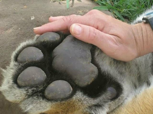 Лапка тигра заметно больше человеческой