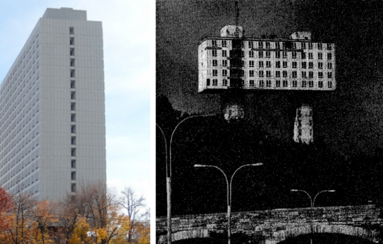 Его строили еще в СССР весьма необычным способом — сверху вниз — сначала сделали столбы для шахт лифта, а потом на них, сверху, начали достраивать здание. Это позволило сократить расходы и время, затраченное на строительство. Сегодня в нем живут сотрудники посольства РФ