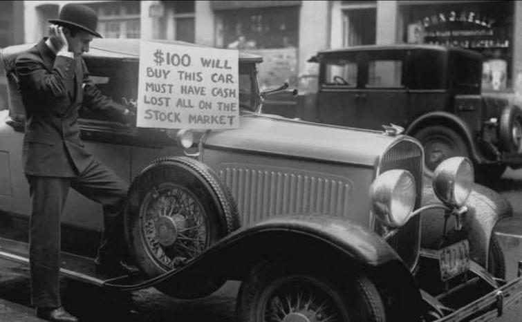 Мужчина пытается продать машину после обвала на фондовой бирже во время Великой Депрессии. Надпись «Отдам за 100$, наличкой, потерял всё на бирже». США, 1929 год