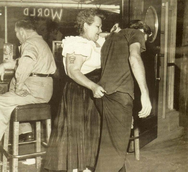 Вышибала провожает клиента бара. Beacon и 5th Sts., San Pedro, CA, ca. 1953.