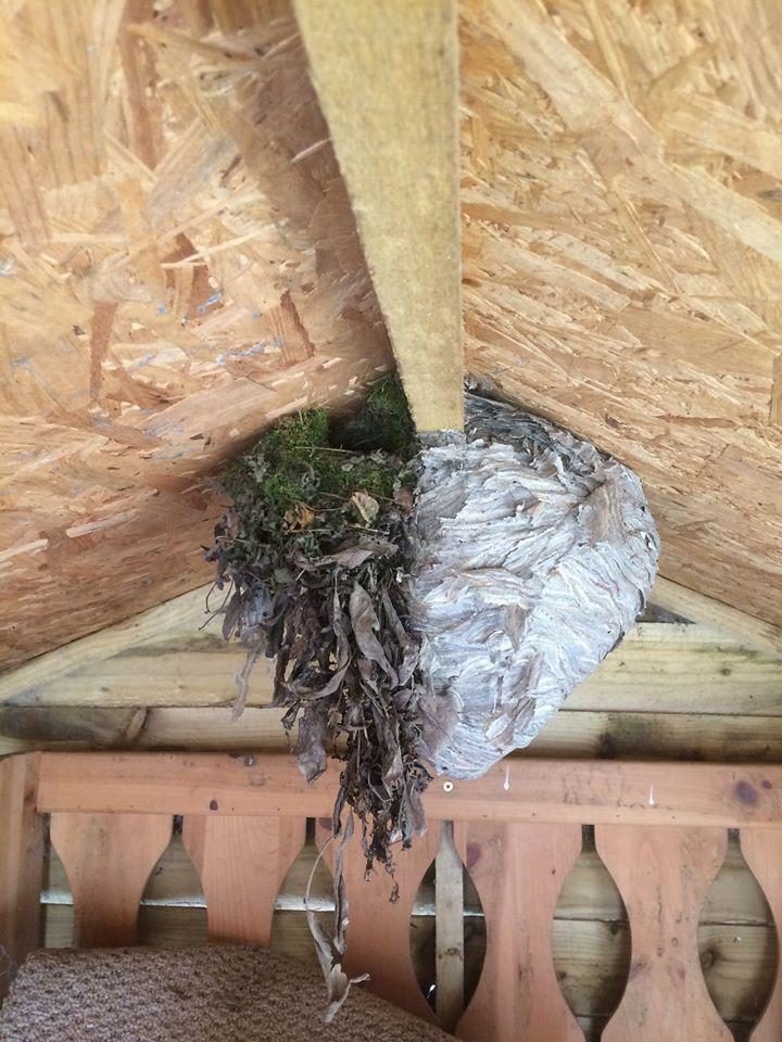 Маловероятные соседи. Гнездо птиц и осиное гнездо, прикреплённые друг к другу