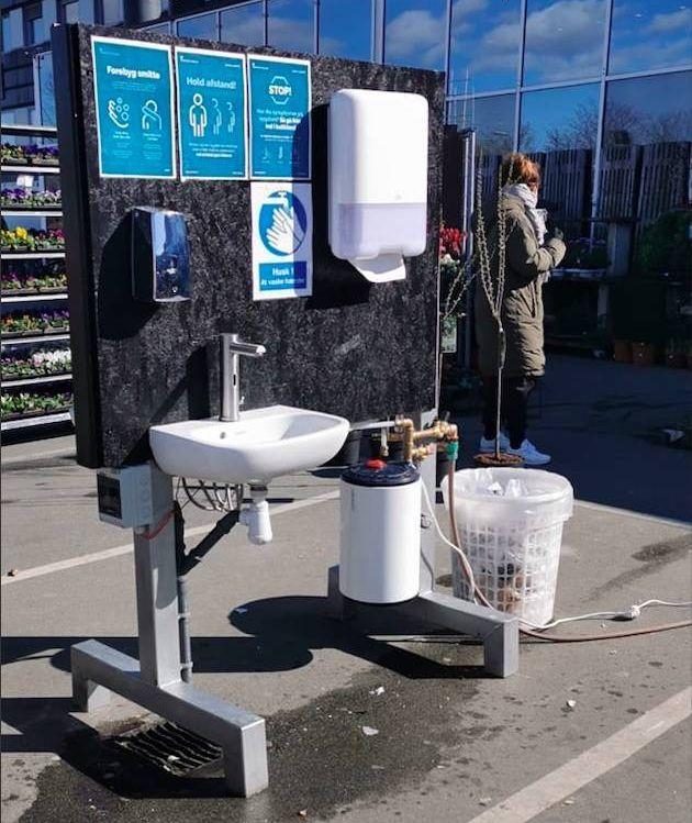 Станция для мытья рук, расположенная рядом с супермаркетом в Дании