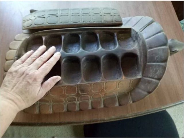 Странная черепаха нашлась в комиссионном магазине. Как удалось установить, это доска для популярной игры на двоих человек из Ганы. Игра называется «вари» — участники раскладывают в ячейки по 4 зернышка, а затем по определенным правилам начинают их двигать, пытаясь забрать зерна оппонента.