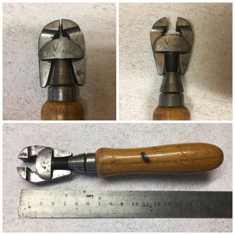Визуально похоже на клещи, но нет ручек, вместо этого резьба и гайка для скручивания верхней части