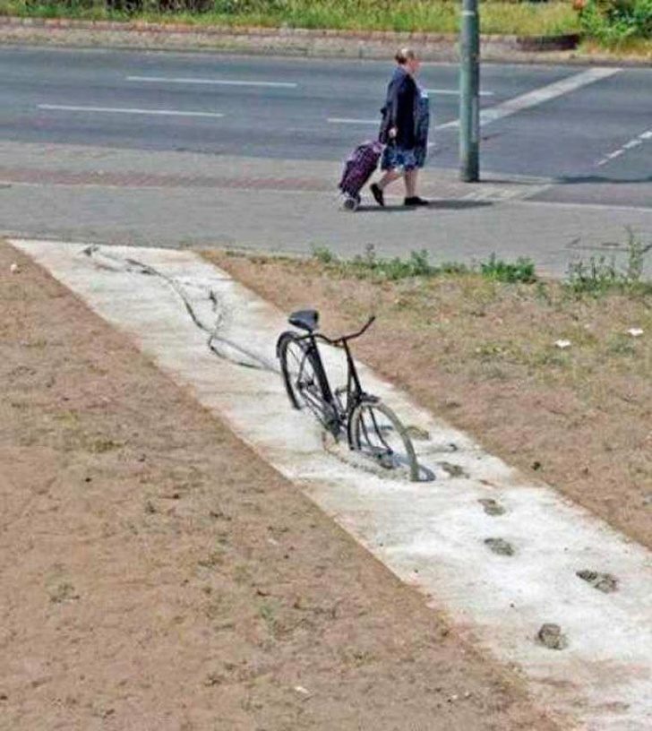Похоже владелец велика был пьян в дрезину… Бетон ведь не за секунду затвердевает.