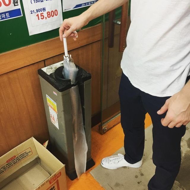 В магазинах при входе установлены пакеты-чехлы для зонтов. В них вставляется мокрый зонтик и уже вместе с пакетом вытягивается через маленькую дверку