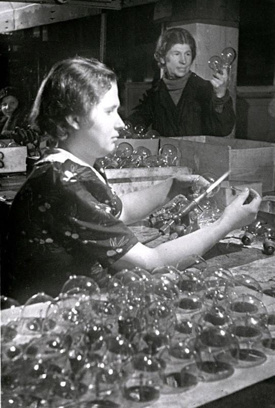 Раньше лампочки восстанавливали. Работницы одного из ленинградских заводов за восстановлением перегоревших электроламп, 1942 год