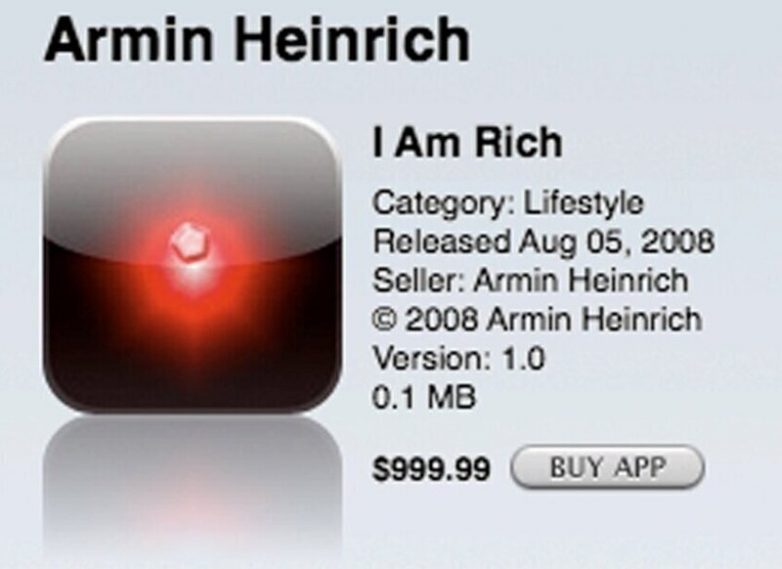 Это не только самое дорогое приложение, но и одно из самых бесполезных. Приложение I Am Rich («Я богат») появилось в 2008 году, тогда за него надо было заплатить 999 долларов и 99 центов (это максимально допустимая цена в iTunes). Приложение показывало владельцу красный сияющий камень, при нажатии на который появлялась надпись «Я богат, я заслуживаю это, я хорош, здоров и успешен». В психологии такие фразочки называются аффирмациями. Тысяча долларов, потраченная на бесполезное приложение, увеличивает эффективность аффирмаций, которые владелец должен произносить по подсказке красного камня. Всего восемь человек купили I Am Rich. Через некоторое время создатель Армин Хайнрих выпустил новую версию приложения. Теперь это калькулятор. В описании указано, что знаменитый камень и мантру можно найти в меню Help. Да, и стоит приложение теперь всего $8,99.