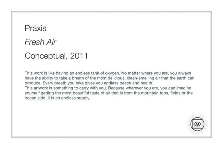 В 2011 году в Нью-Йорке был создан Музей невидимого искусства. В музее есть картины, скульптуры, фильмы и даже воздух. Все экспонаты существуют исключительно в виде описаний. Богатой американке Эйми Дэвидсон так понравилась идея проекта, что она решила купить «Свежий воздух» за 10 тыс. долларов. А идея у создателей не так уж и плоха. Звучит она примерно так: «Раз современное искусство имеет отношение только к деньгам, но никак не к искусству, то давайте хотя бы не захламлять мир бездарными, но дорогущими поделками, а будем продавать воздух под видом искусства. Художественной разницы всё равно нет». Предлагаю вам вдохнуть «Свежего воздуха» бесплатно, вот его описание:«Эта работа как будто бесконечный баллон с кислородом. Неважно, где вы находитесь, у вас всегда будет возможность вдохнуть изысканнейший, чистейший воздух на всей Земле. Каждый вдох даёт вам бесконечные мир и здоровье.