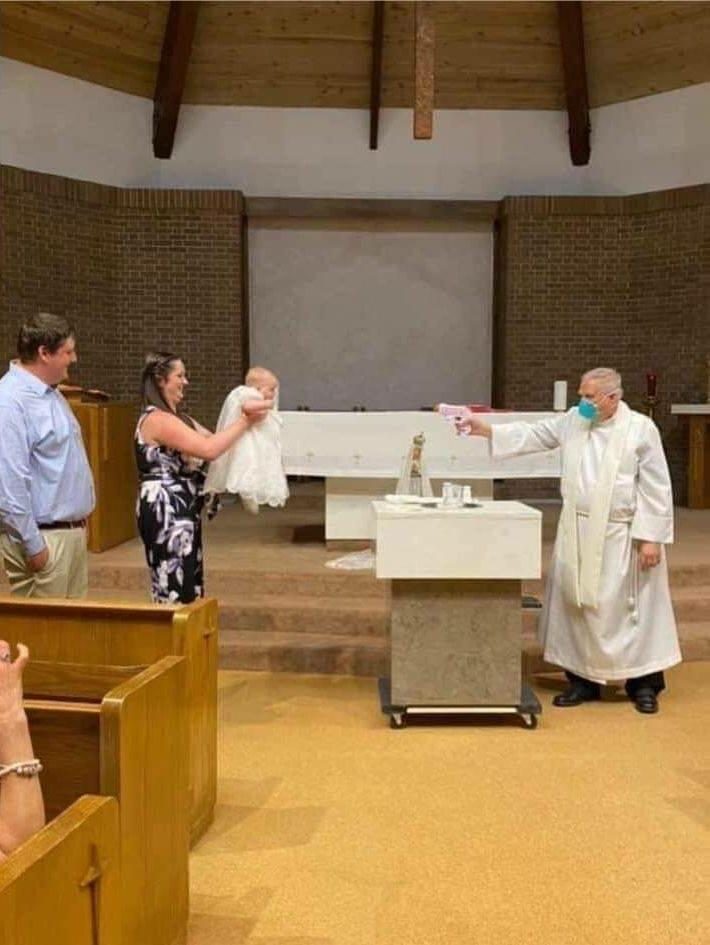 Нет, это не кадр из комедии. Вот так крестили детей в 2020 году. А что делать? Социальная дистанция