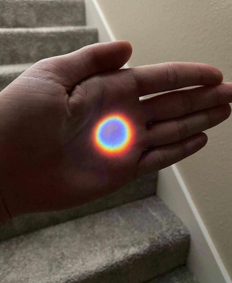 Идеальная круглая радуга, получившаяся благодаря солнечному свету, прошедшему через дверной глазок
