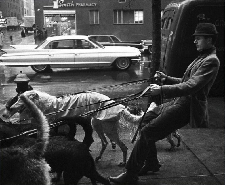 Дог-ситтер выгуливает собак, Нью-Йорк, 1964 год.