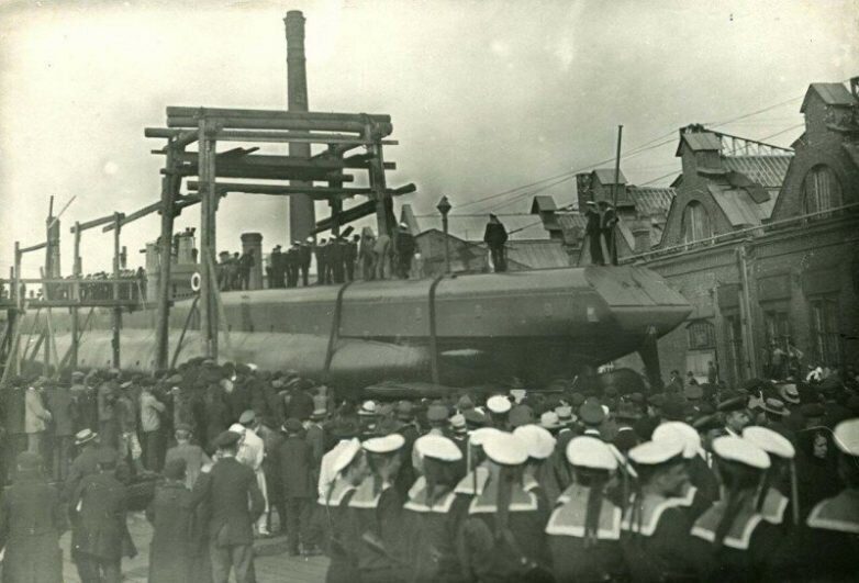 Спуск минного заградителя «Ерш» со стапелей Балтийского судостроительного и механического завода. 1917