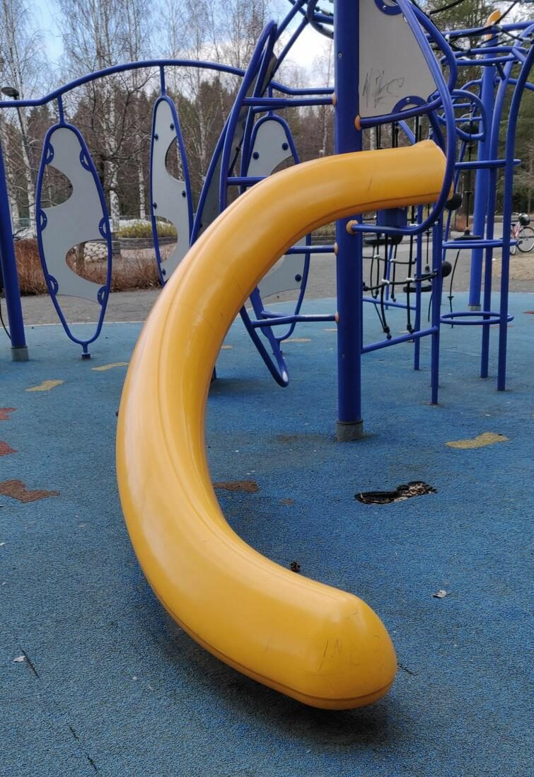 Это не совсем обычная для нас горка, потому что спускаться предполагается не в ней, а НА ней. С таким поворотом падение детям практически обеспечено.