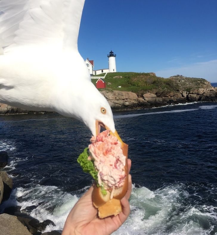 Девушка только хотела сделать фотографию своего ролла с лобстером, как эта наглая птица украла его.