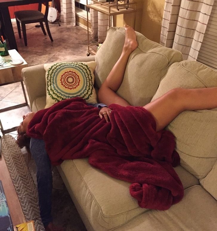 Одеяло принес заботливый муж. Он же не стал перекладывать – пусть спит, как ей удобно.