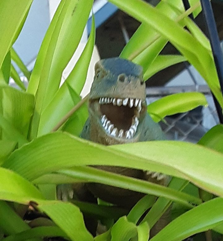 10-летняя дочь решила напугать маму, спрятав среди цветов игрушечного динозавра