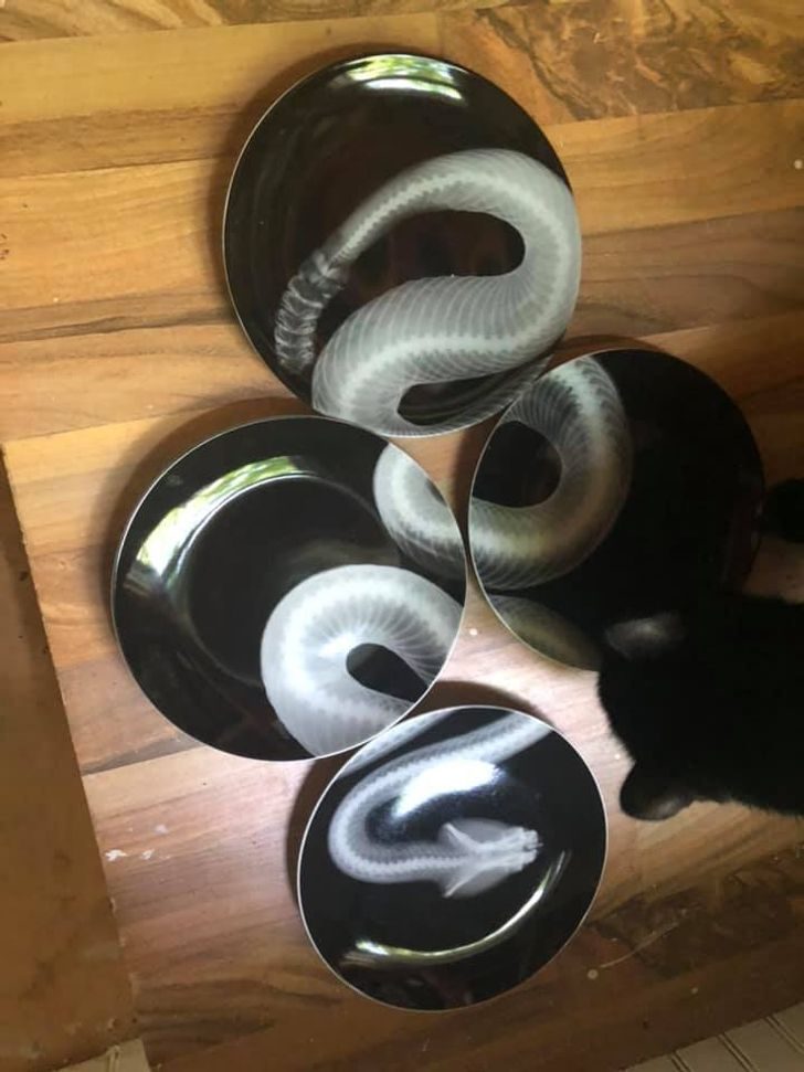 Комплект тарелок, на котором изображен снимок змеи в рентгеновских лучах