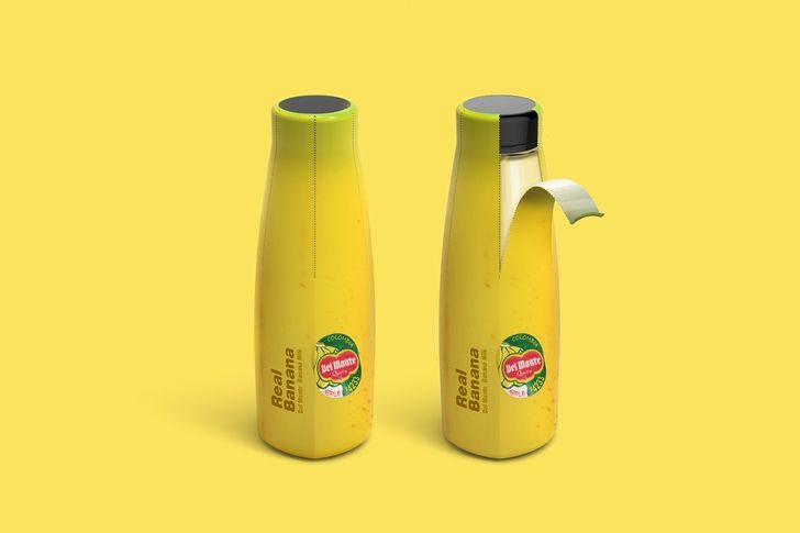 Банановое молоко разливают по емкостям, где внешняя оболочка напоминает кожуру банана